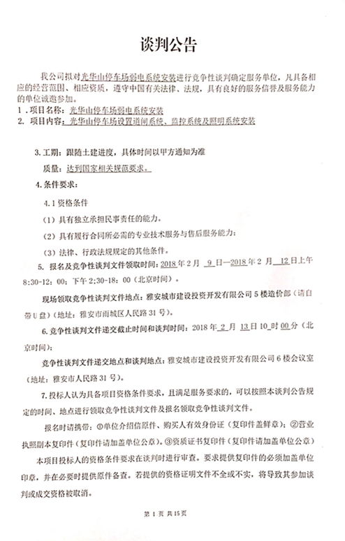 關于光華山停車場弱電系統(tǒng)安裝進行競爭性談判確定服務單位的邀請函