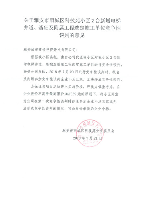 關(guān)于雅安科技苑小區(qū)新增電梯井道、基礎(chǔ)及附屬工程競爭性談判的結(jié)果公示