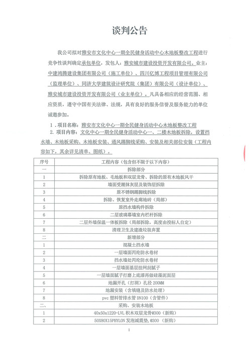 雅安市文化中心一期全民健身活動(dòng)中心木地板整改工程——競(jìng)爭(zhēng)性談判公告