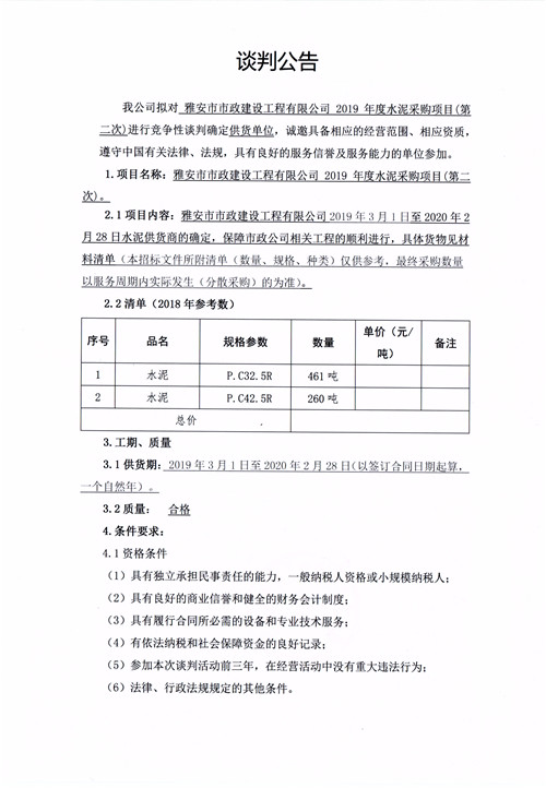 市政公司2019年度水泥采購(gòu)項(xiàng)目(第二次)競(jìng)爭(zhēng)性談判公告