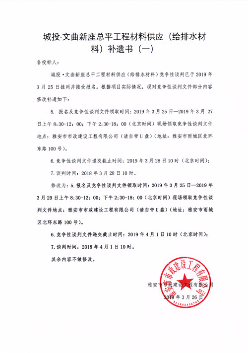 城投·文曲新座總平工程材料供應(yīng)(給排水材料)競爭性談判公告補遺一