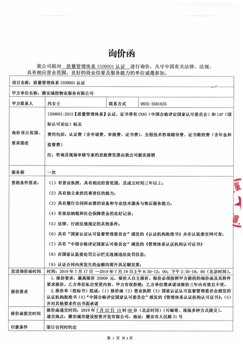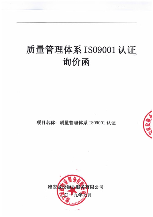 城投物業(yè)質(zhì)量管理體系IS09001認證詢價函