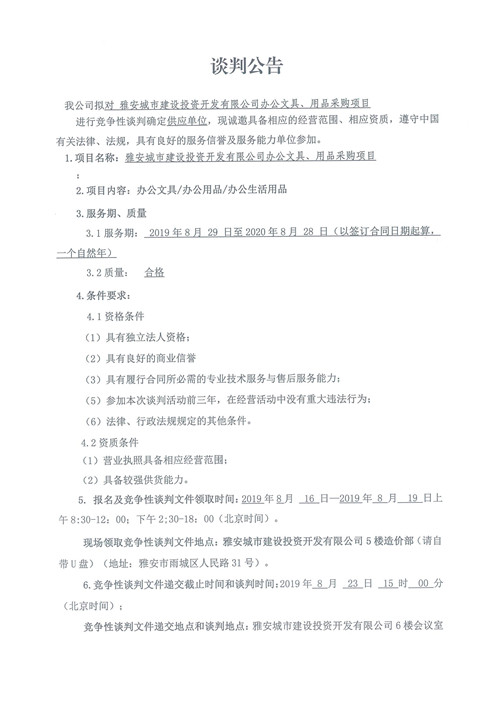 雅安城市建設(shè)投資開發(fā)有限公司辦公文具、用品采購(gòu)項(xiàng)目競(jìng)爭(zhēng)性談判公告