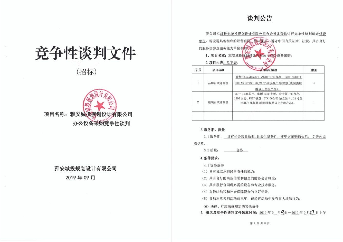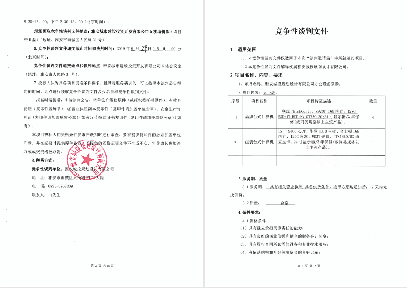 雅安城投規(guī)劃設(shè)計(jì)有限公司辦公設(shè)備采購進(jìn)行競爭性談判的公告