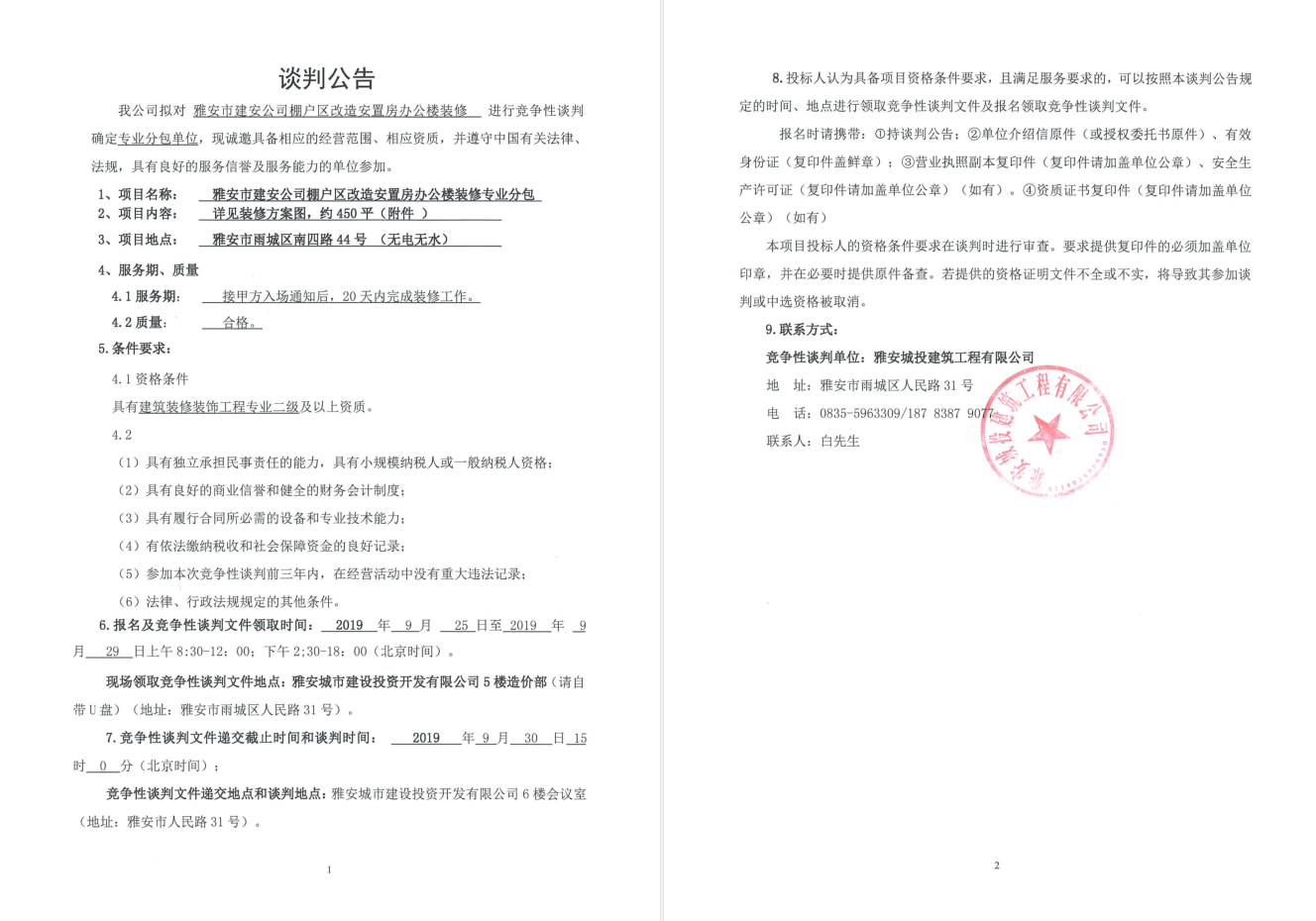 雅安市建安公司棚改區(qū)改造安置房辦公樓裝修競爭性談判公告