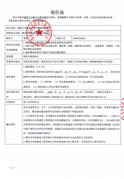 城投公司新辦公樓花箱詢價(jià)函