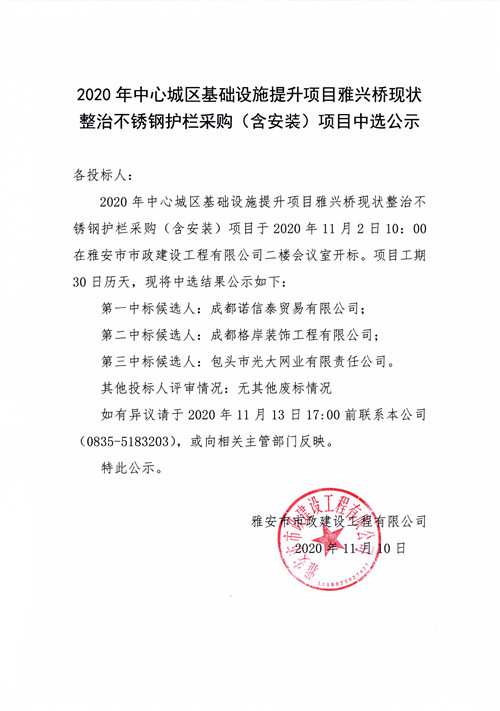 2020年中心城區(qū)基礎(chǔ)設(shè)施提升項(xiàng)目雅興橋現(xiàn)狀整治不銹鋼護(hù)欄采購(gòu)(含安裝)項(xiàng)目中選公示