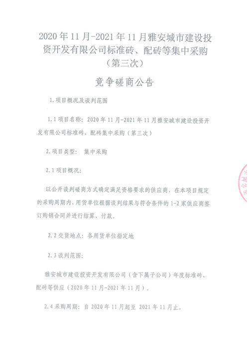 2020年11月-2021年11月雅安城市建設(shè)投資開發(fā)有限公司標(biāo)準(zhǔn)磚、配磚等集中采購(第三次)競(jìng)爭(zhēng)磋商公告