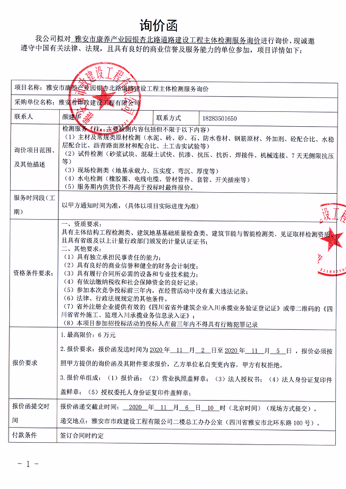 雅安市康養(yǎng)產(chǎn)業(yè)園銀杏北路道路建設(shè)工程主體檢測服務(wù)詢價函