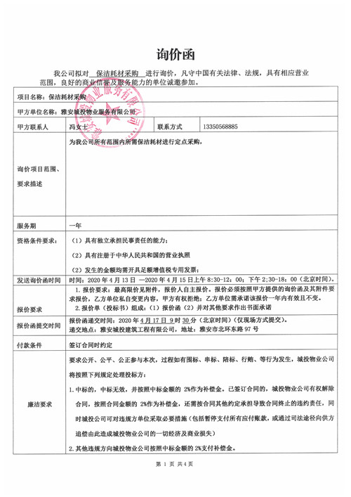 城投物業(yè)公司保潔耗材采購詢價(jià)函(第二次)