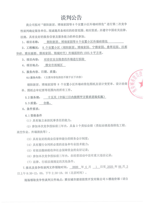 城投公司“朝陽新居、博瑞家園等8個安置小區(qū)外墻磚排危”競爭性談判公告(第二次)