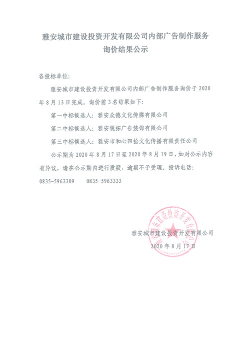 雅安城市建設(shè)投資開發(fā)有限公司公司內(nèi)部廣告制作服務(wù)詢價(jià)結(jié)果公示