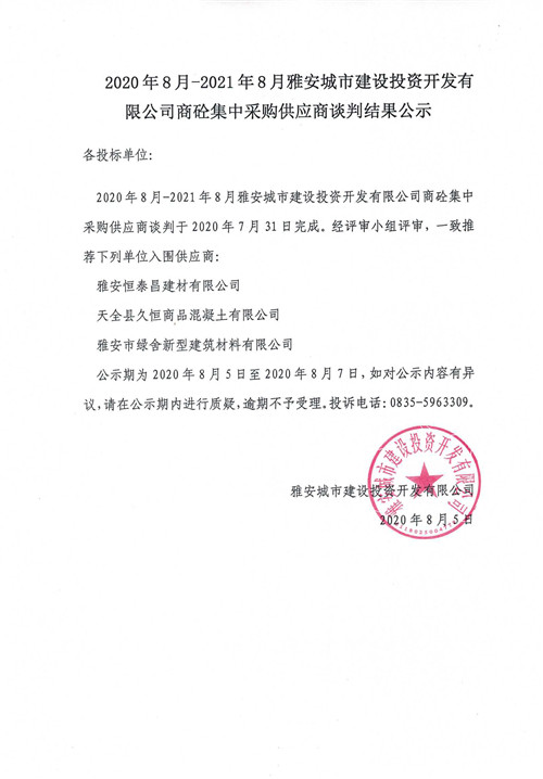 2020年8月-2021年8月雅安城市建設(shè)投資開(kāi)發(fā)有限公司商砼集中采購(gòu)供應(yīng)商談判結(jié)果公示