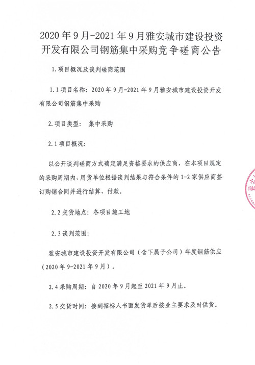 2020年9月-2021年9月雅安城市建設(shè)投資開發(fā)有限公司鋼筋集中采購競爭磋商公告