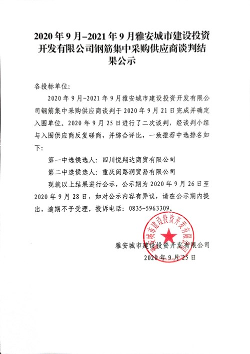 2020年9月—2021年9月雅安城市建設(shè)投資開(kāi)發(fā)有限公司鋼筋集中采購(gòu)供應(yīng)商談判結(jié)果公示