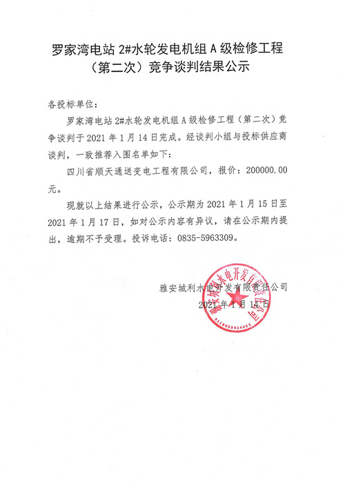 城利水電公司羅家灣電站2#水輪發(fā)電機(jī)組A級(jí)檢修工程(第二次)競爭性談判結(jié)果公示