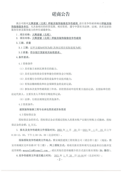 雅安城投建筑工程有限公司大興壹號(hào)(北苑)樣板房裝飾裝修競(jìng)爭(zhēng)性磋商公告