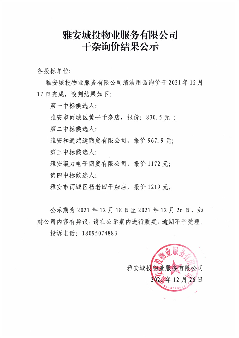 雅安城投物業(yè)服務(wù)有限公司食堂干雜詢價(jià)結(jié)果公示