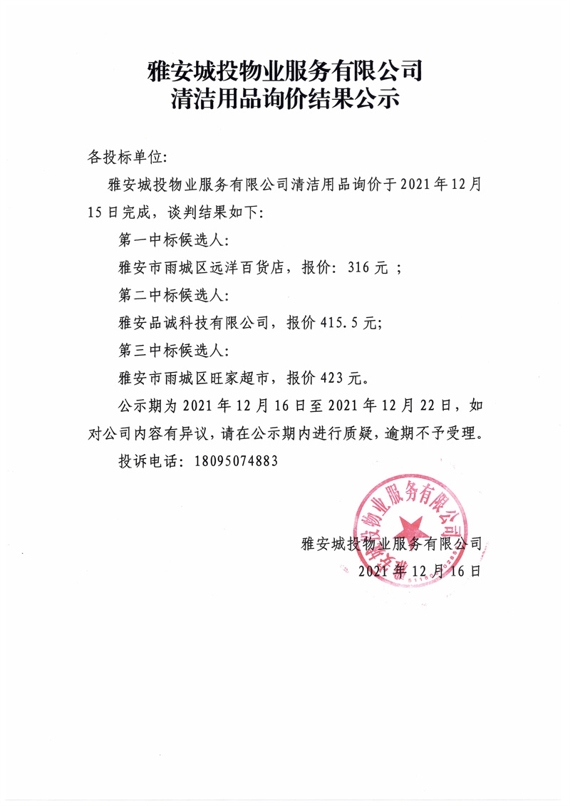 雅安城投物業(yè)服務(wù)有限公司清潔用品詢價結(jié)果公示