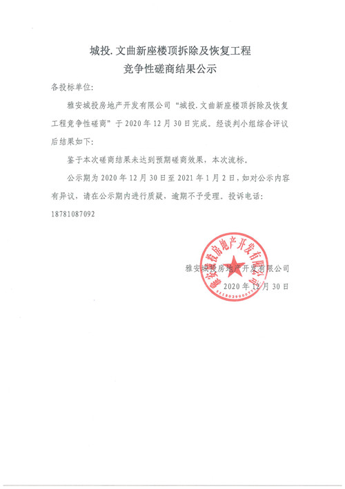 城投·文曲新座樓頂拆除及恢復(fù)工程競爭性磋商結(jié)果公示