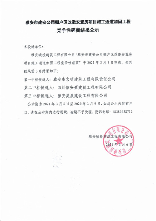 城投建工公司雅安市建安公司棚戶區(qū)改造安置房項目施工通道加固工程競爭性磋商結果公示