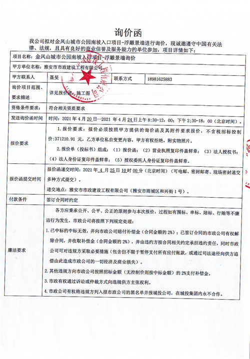 金鳳山城市公園南坡入口項(xiàng)目-浮雕景墻詢價(jià)函