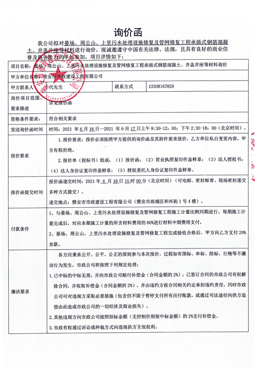 雅安城投市政公司晏場、周公山、上里污水處理設(shè)施修復(fù)及管網(wǎng)修復(fù)工程承插式鋼筋混凝土、井蓋井座等材料詢價(jià)函