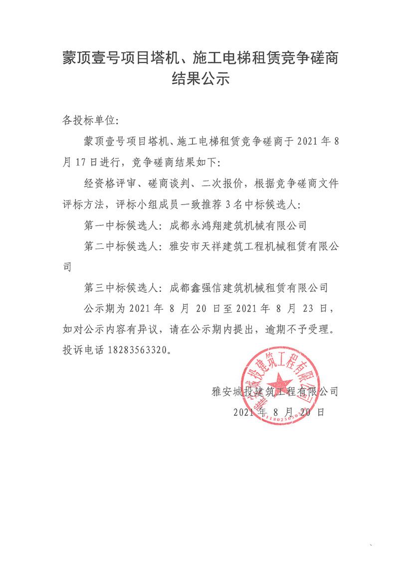 城投建工公司蒙頂壹號(hào)項(xiàng)目塔機(jī)、施工電梯租賃競(jìng)爭(zhēng)磋商結(jié)果公告