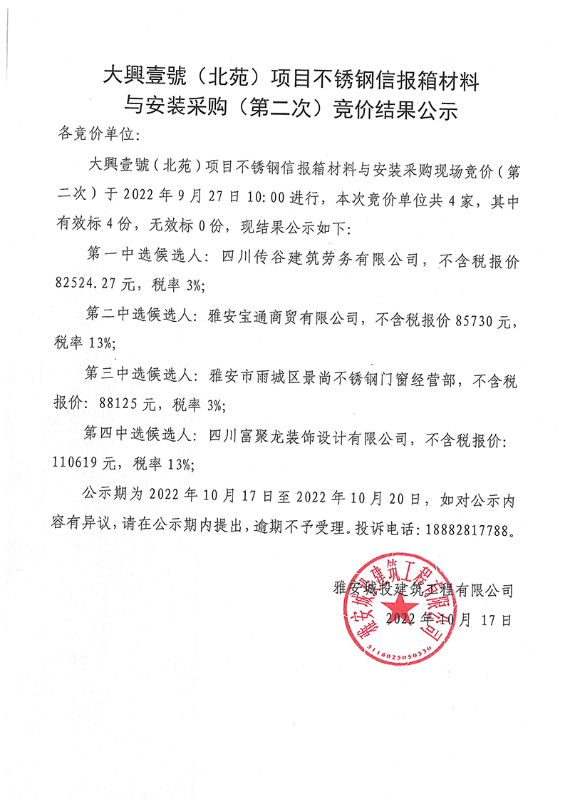 大興壹號(hào)(北苑)項(xiàng)目不銹鋼信報(bào)箱材料與安裝采購(第二次)競(jìng)價(jià)結(jié)果公示