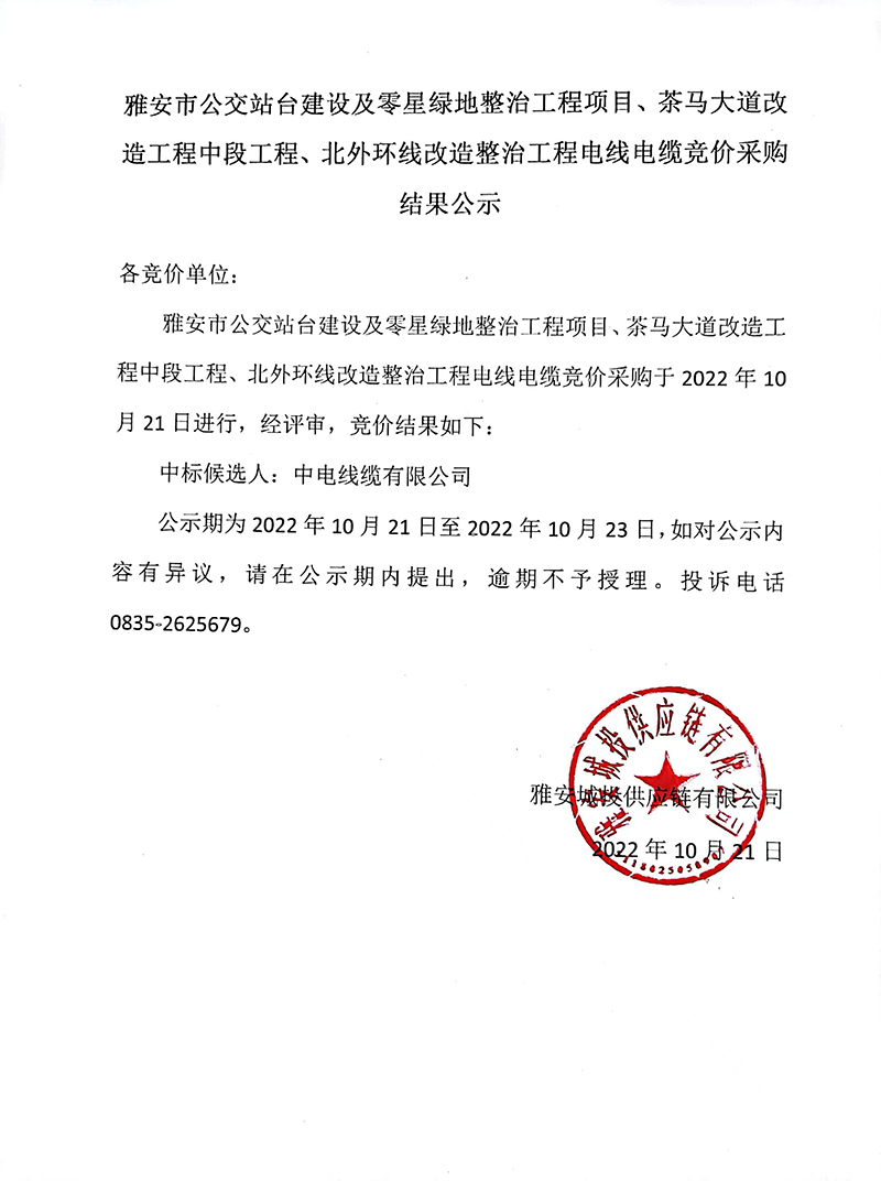 雅安市公交站臺建設(shè)及零星綠地整治工程項(xiàng)目、茶馬大道改造工程中段工程、北外環(huán)線改造整治工程電線電纜采購競價(jià)結(jié)果公告