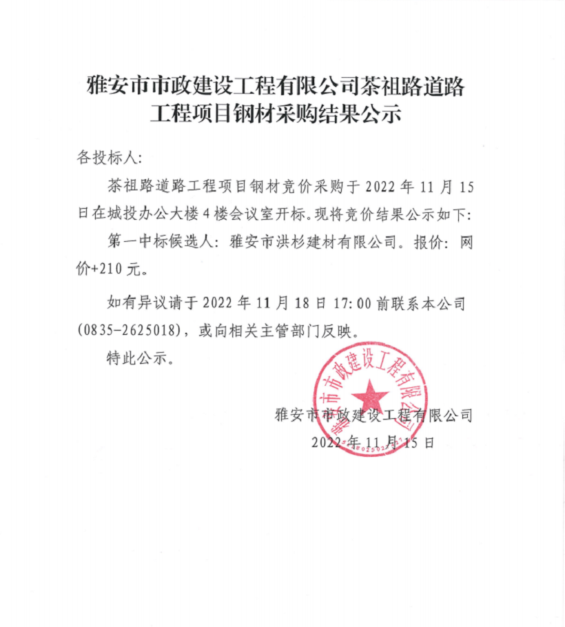雅安市市政建設工程有限公司茶祖路道路工程項目鋼材采購結果公示