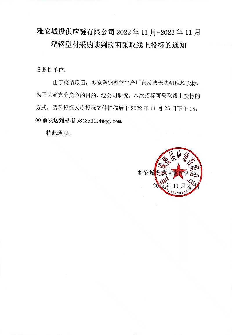 雅安城投供應(yīng)鏈有限公司2022年11月-2023年11月塑鋼型材采購(gòu)談判磋商采取線上投標(biāo)的通知