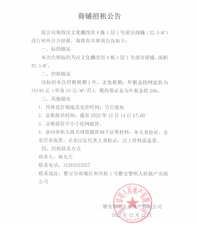 漢文化棚改房4棟1層1號(hào)部分商鋪招租公告