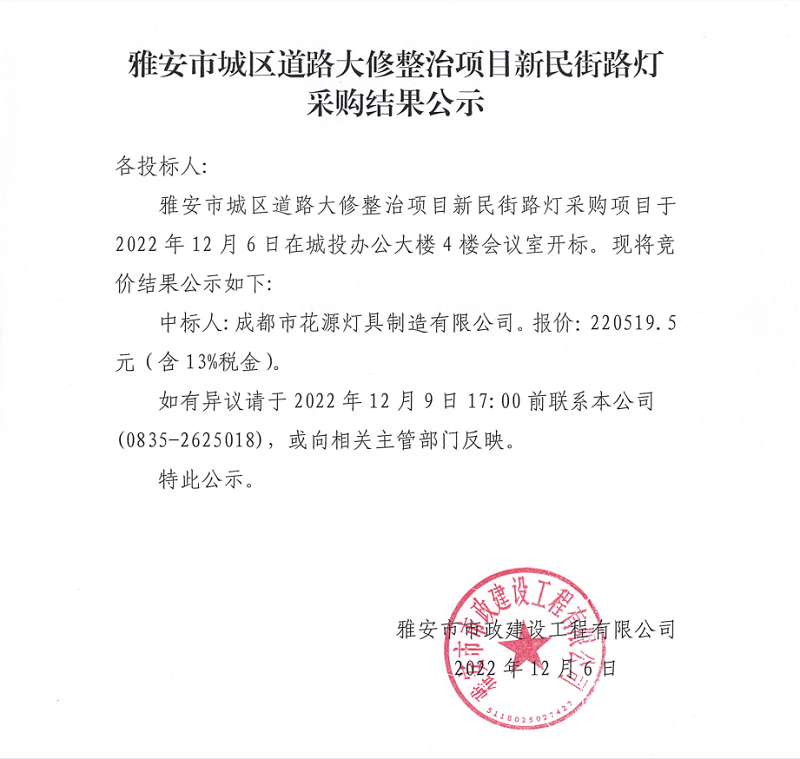 雅安市城區(qū)道路大修整治項(xiàng)目新民街路燈采購結(jié)果公示