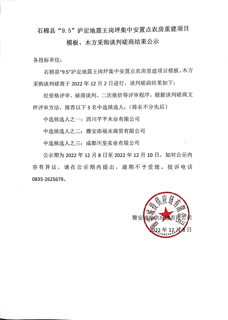 石棉縣“9.5”瀘定地震王崗坪集中安置點農(nóng)房重建項目模板、木方采購談判磋商結果公示