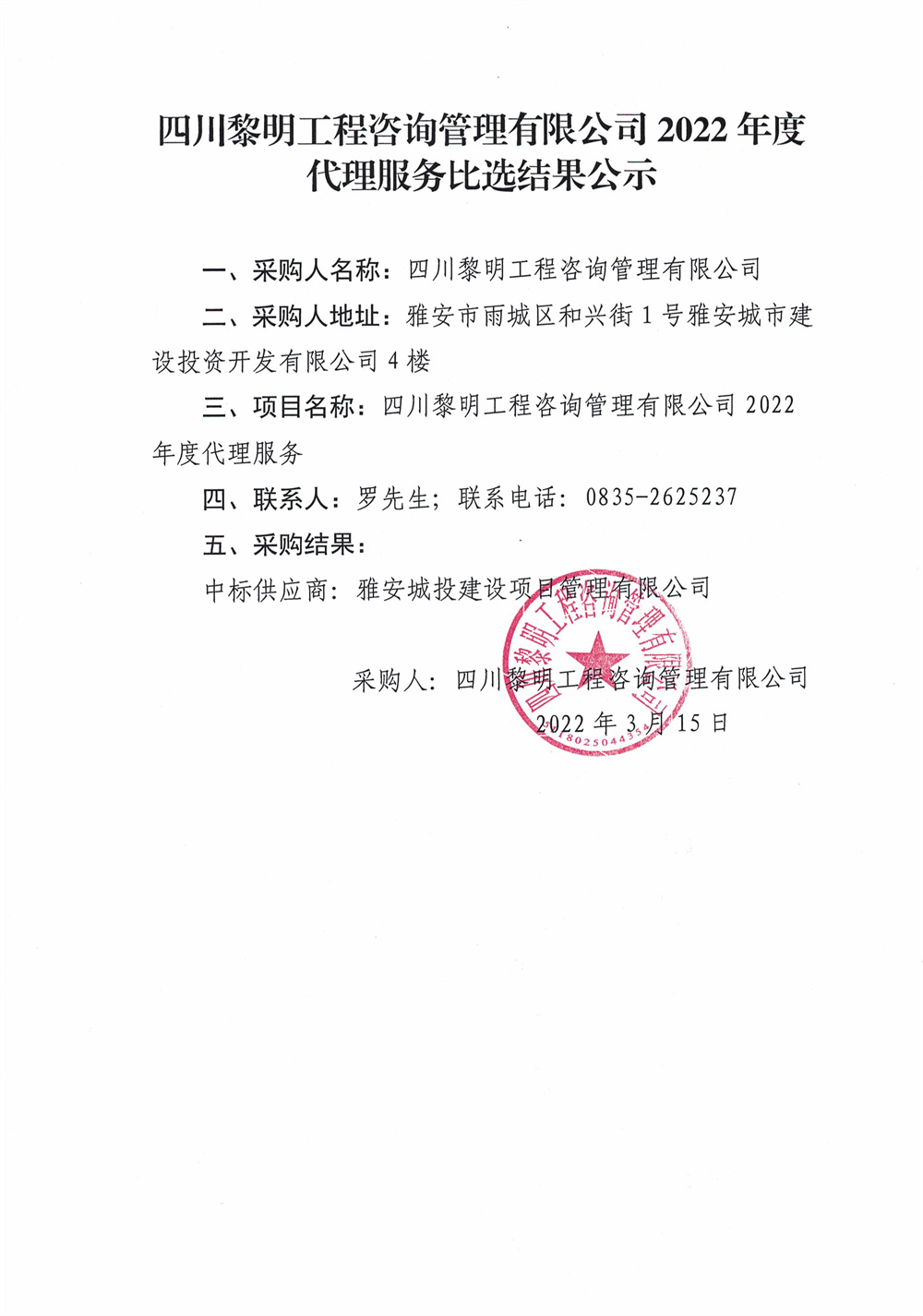 四川黎明工程咨詢管理有限公司2022年度代理服務必選結果公示