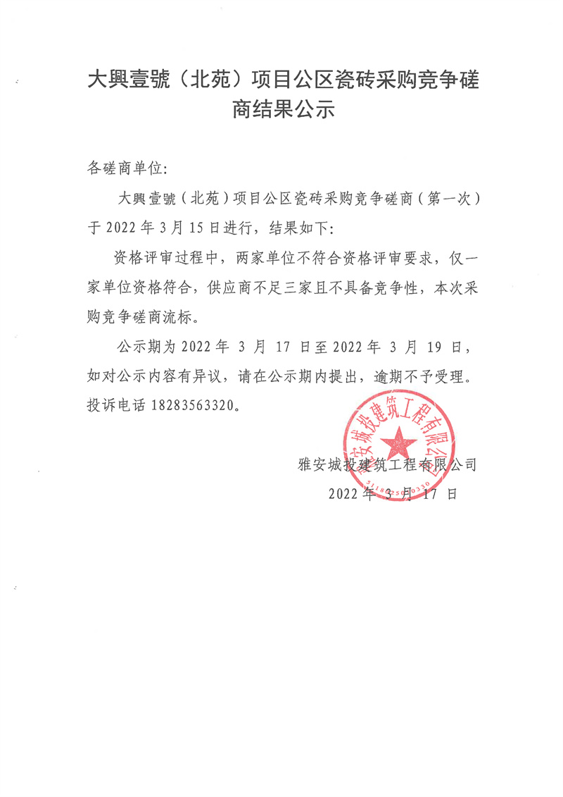 城投建工公司大興壹號(北苑)項(xiàng)目公區(qū)瓷磚采購競爭磋商結(jié)果公示