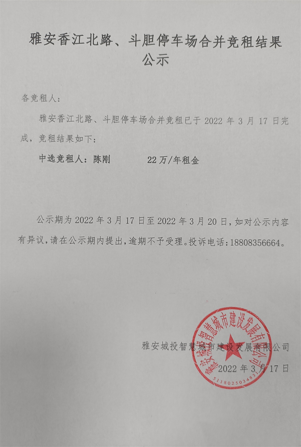 雅安香江北路停車場、斗膽停車場兩處停車場合并競租結(jié)果公示