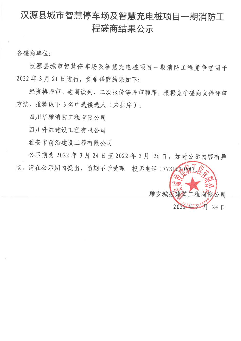 漢源縣城市智慧停車場及智慧充電樁項(xiàng)目一期消防工程磋商結(jié)果公示