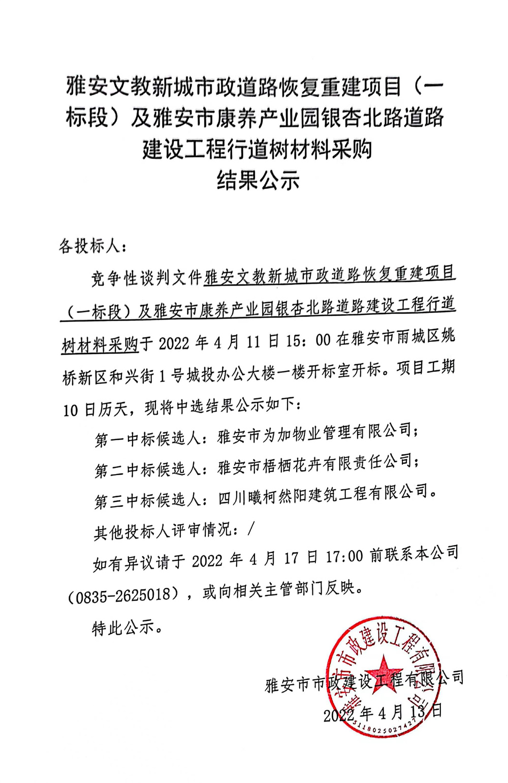 雅安文教新城市政道路恢復(fù)重建項目(一標段)及雅安市康養(yǎng)產(chǎn)業(yè)園銀杏北路道路建設(shè)工程行道樹材料采購結(jié)果公示