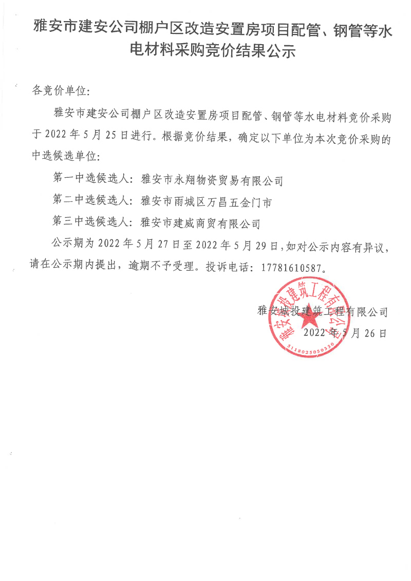 雅安市建安公司棚戶區(qū)改造安置房項(xiàng)目配管、鋼管等水電材料采購(gòu)競(jìng)價(jià)結(jié)果公示