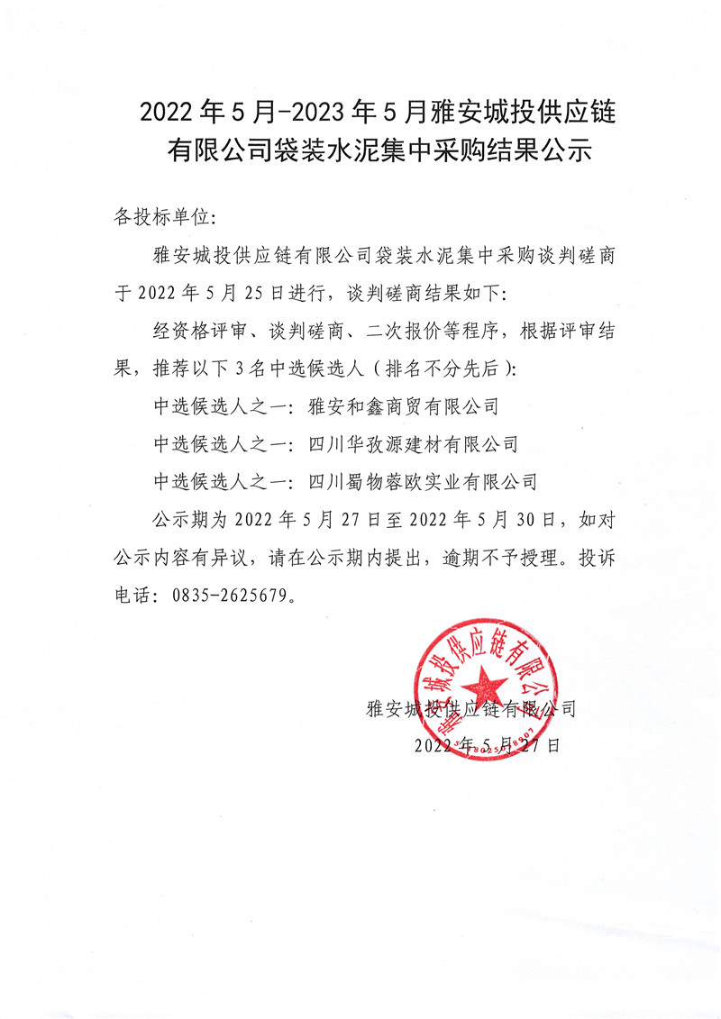 2022年5月-2023年5月雅安城投供應鏈有限公司袋裝水泥集中采購結(jié)果公示