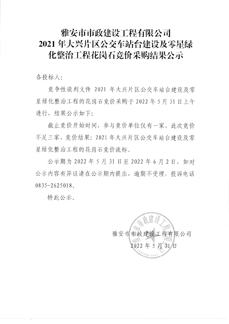 雅安市2021年大興片區(qū)公交車站臺(tái)建設(shè)及零星綠化整治工程項(xiàng)目花崗石材料競價(jià)采購結(jié)果公示
