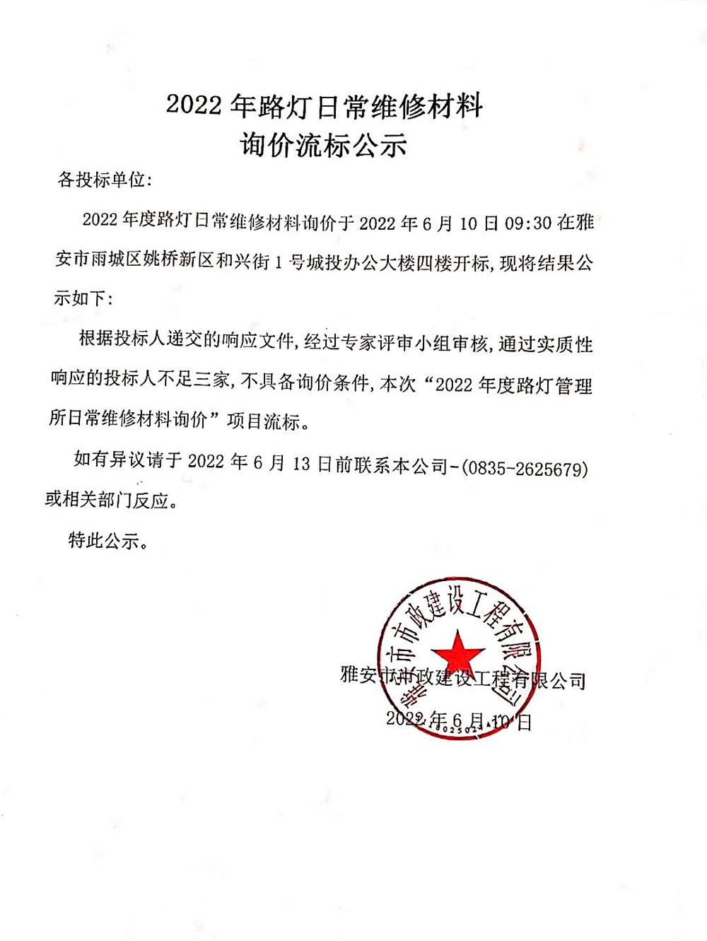 2022年路燈日常維修材料詢價(jià)流標(biāo)公示