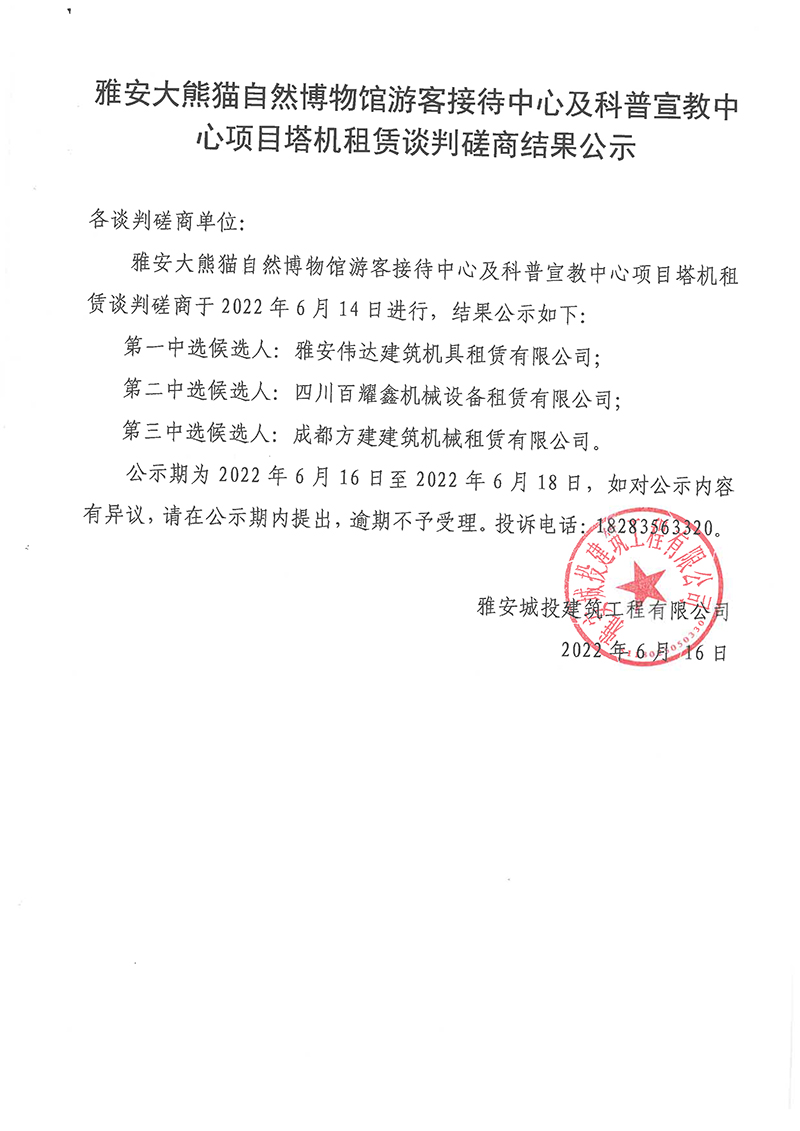 雅安大熊貓自然博物館游客接待中心及科普宣教中心項(xiàng)目塔機(jī)租賃談判磋商結(jié)果公示