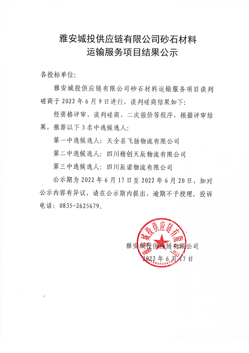 雅安城投供應鏈有限公司砂石材料運輸服務項目結果公示