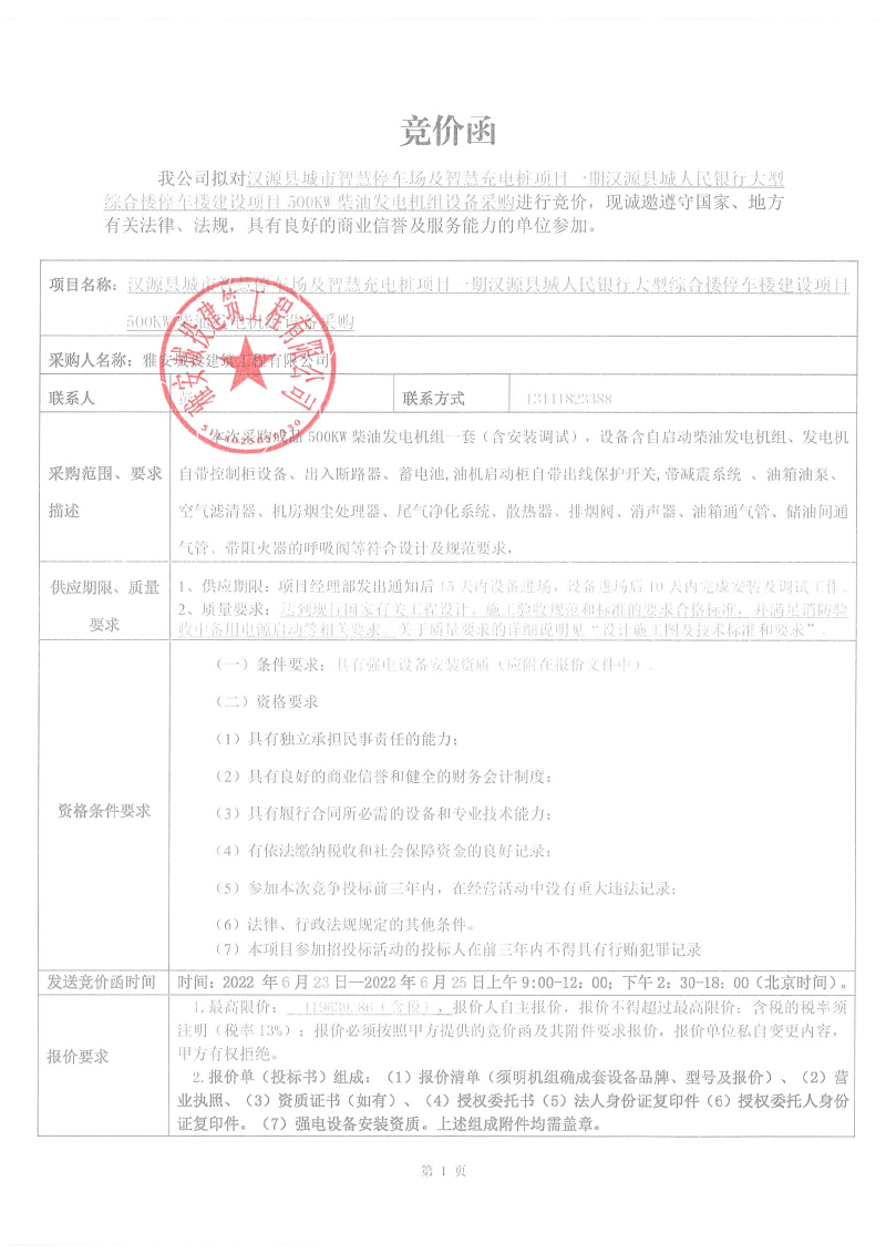 漢源縣城市智慧停車場及智慧充電樁項目一期漢源縣城人民銀行大型綜合樓停車樓建設(shè)項目500kw柴油發(fā)電機(jī)組設(shè)備采購競價公告