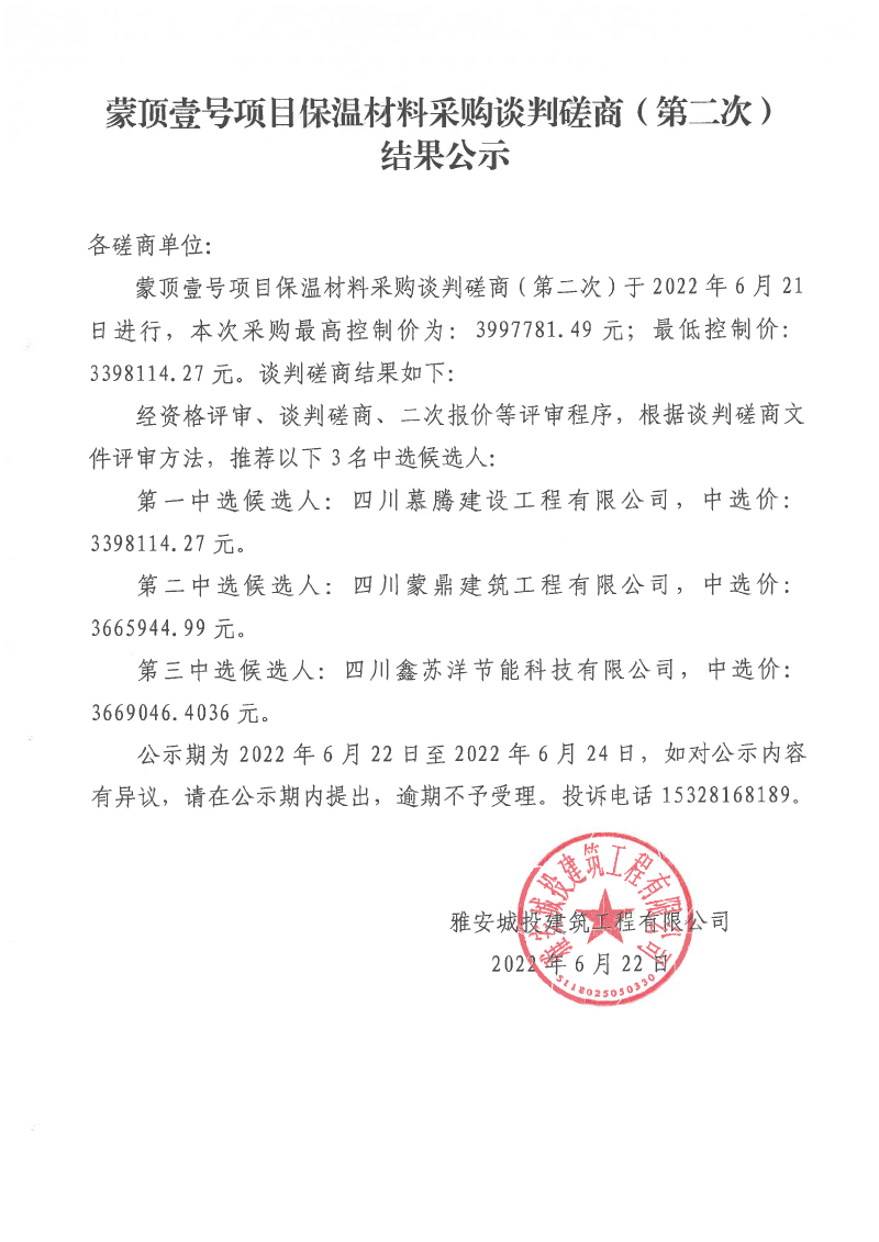 蒙頂壹號(hào)項(xiàng)目保溫材料采購(gòu)談判磋商(第二次)結(jié)果公示