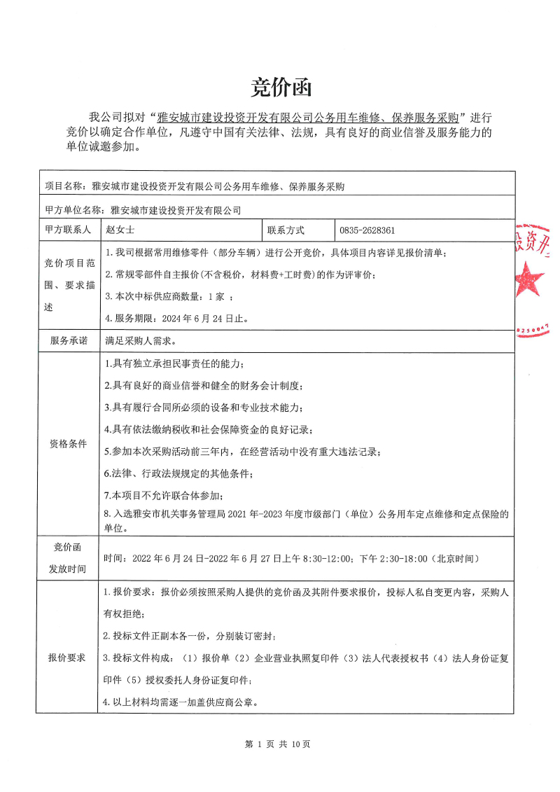 雅安城市建設(shè)投資開發(fā)有限公司 公務(wù)用車維修、保養(yǎng)服務(wù)采購項目競價公告