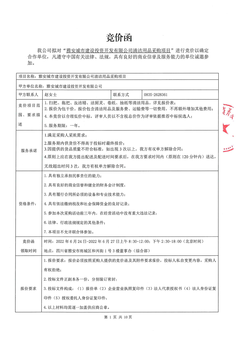雅安城市建設(shè)投資開發(fā)有限公司清潔用品采購項(xiàng)目競價(jià)公告